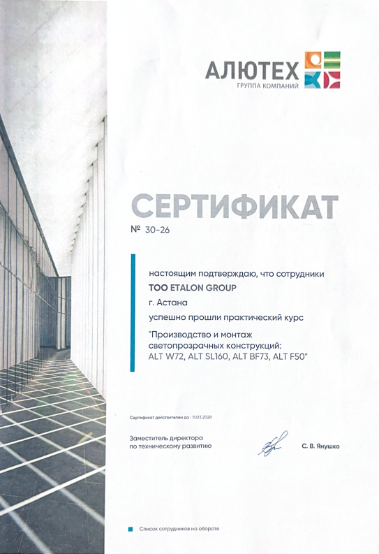 В рамках программы специалисты освоили современные решения в области производства и монтажа светопрозрачных конструкций, включая системы ALT W72, ALT SL160, ALT BF73 и ALT F50. По итогам обучения квалификация сотрудников подтверждена официальным сертификатом производителя.