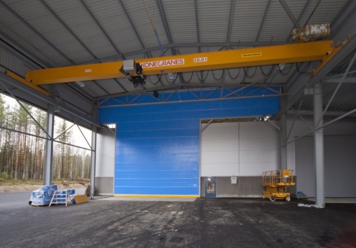 Ангарные ворота шторного типа изготавливаются из ПВХ материала на жеском алюминиевом каркасе. Цельное Т-образная штора регметично закрывает весь стенной проем и автоматически поднимвается вверх, освобождая его для прохода мостового крана.